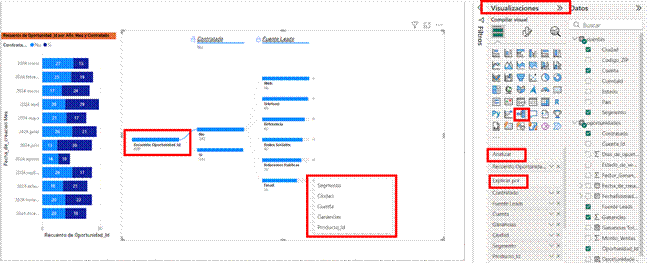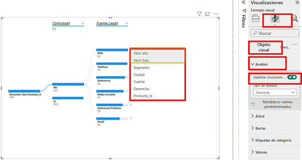 La cantidad de oportunidades en este escenario actúa como el indicador raíz. Al hacer clic en el símbolo de más (+) al final de este campo en el gráfico, se despliegan las categorías añadidas, permitiendo expandirlas según el enfoque de nuestro análisis. Por ejemplo, primero podemos agregar la categoría «Contratado» y evaluar la cantidad de oportunidades con resultados «Sí» o «No». Así, la cantidad de oportunidades va de un total de 489, a 247 para la opción “No” en “Contratado” por ejemplo. Luego, dentro del grupo «No», podemos expandir la categoría «Fuente Lead» para observar la distribución de oportunidades con estas características.