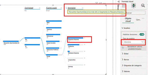 Figura 3. Tipo de Análisis Absoluto en el que se despliega la categoría Segmento y un comentario que describe que la cantidad de oportunidades es más alta si el segmento es «Pequeña Empresa».