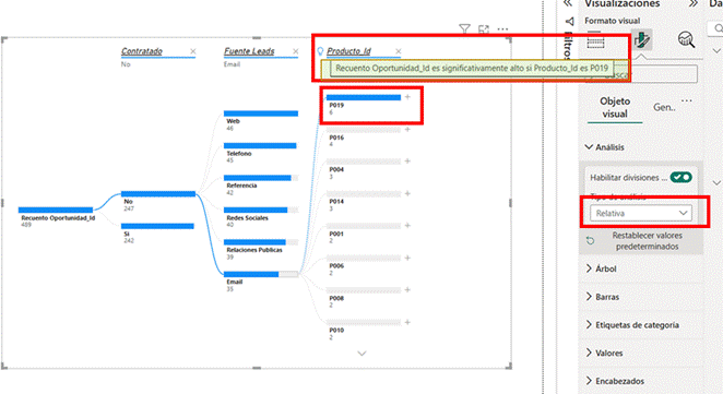 Si escogemos el tipo relativo y nuevamente expandimos en «Valor alto» para «Email», esta vez se despliega automáticamente la categoría «Producto» conectada al artículo «P019», con un comentario que indica que la cantidad de oportunidades es significativamente alta si el producto es este último artículo.
